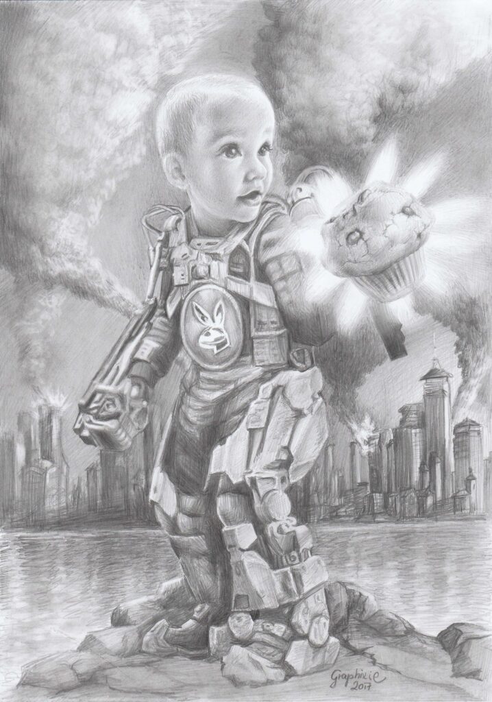 This picture : Kid shoot muffin. Size : A4 Tipe : graphite drawing